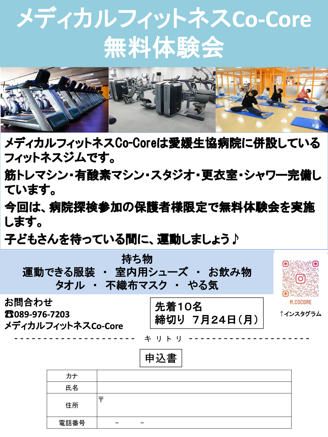 子ども病院探検に参加されている保護者様限定10名(先着)に、メディカルフィットネスコ・コア の無料体験を実施致します。