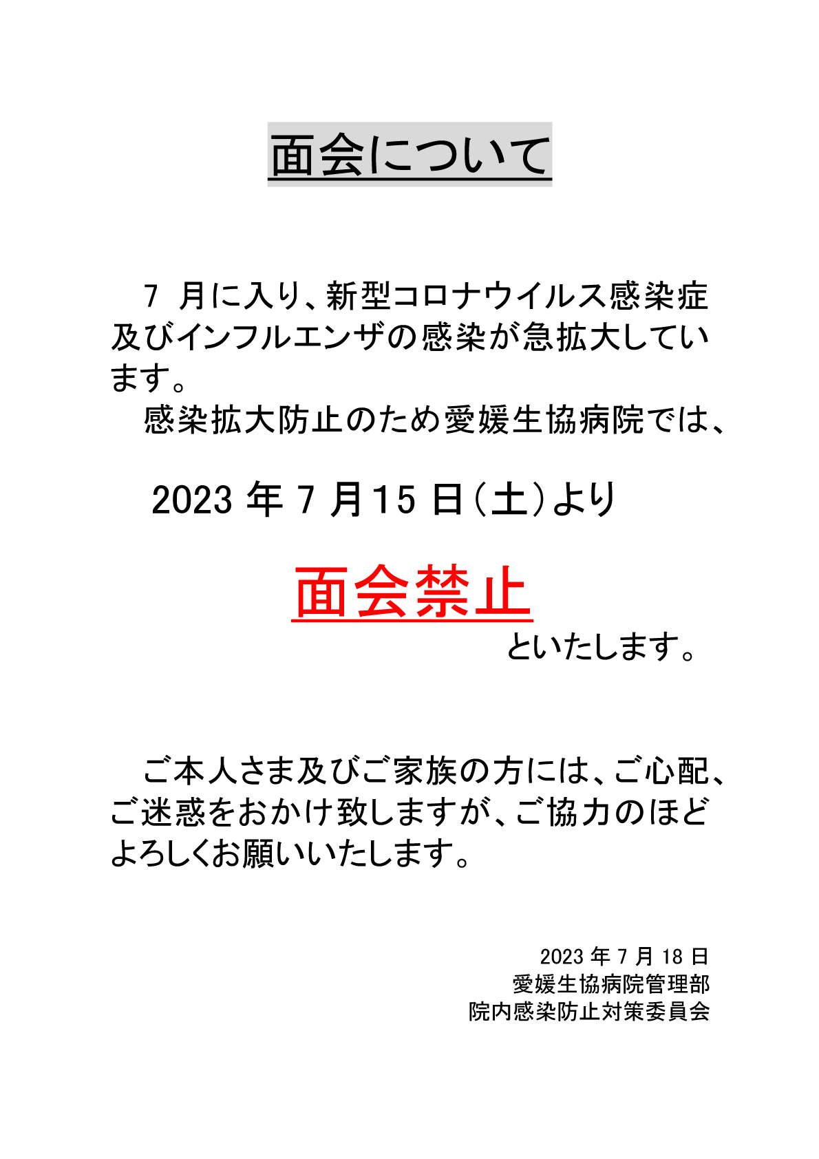 7月に入り、新型コロナウイルス感染症及びインフルエンザの感染の急拡大に伴い面会禁止と致します。