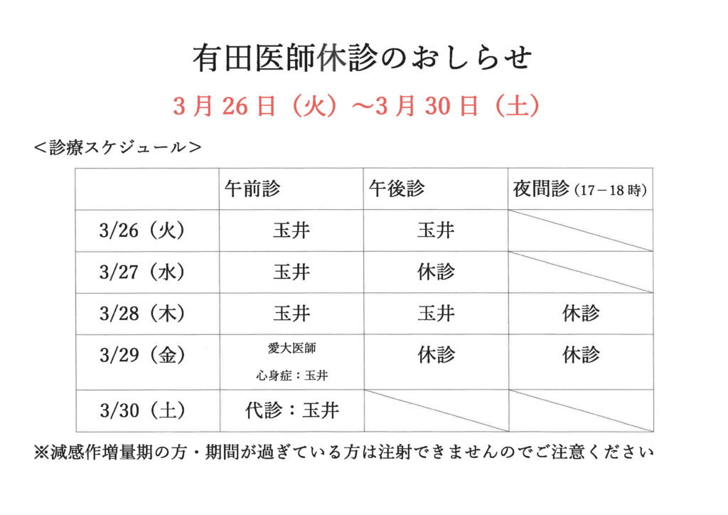 3月6日(水)~3月8日(土)、3月21日(木)~3月22日(金)が休診となります。