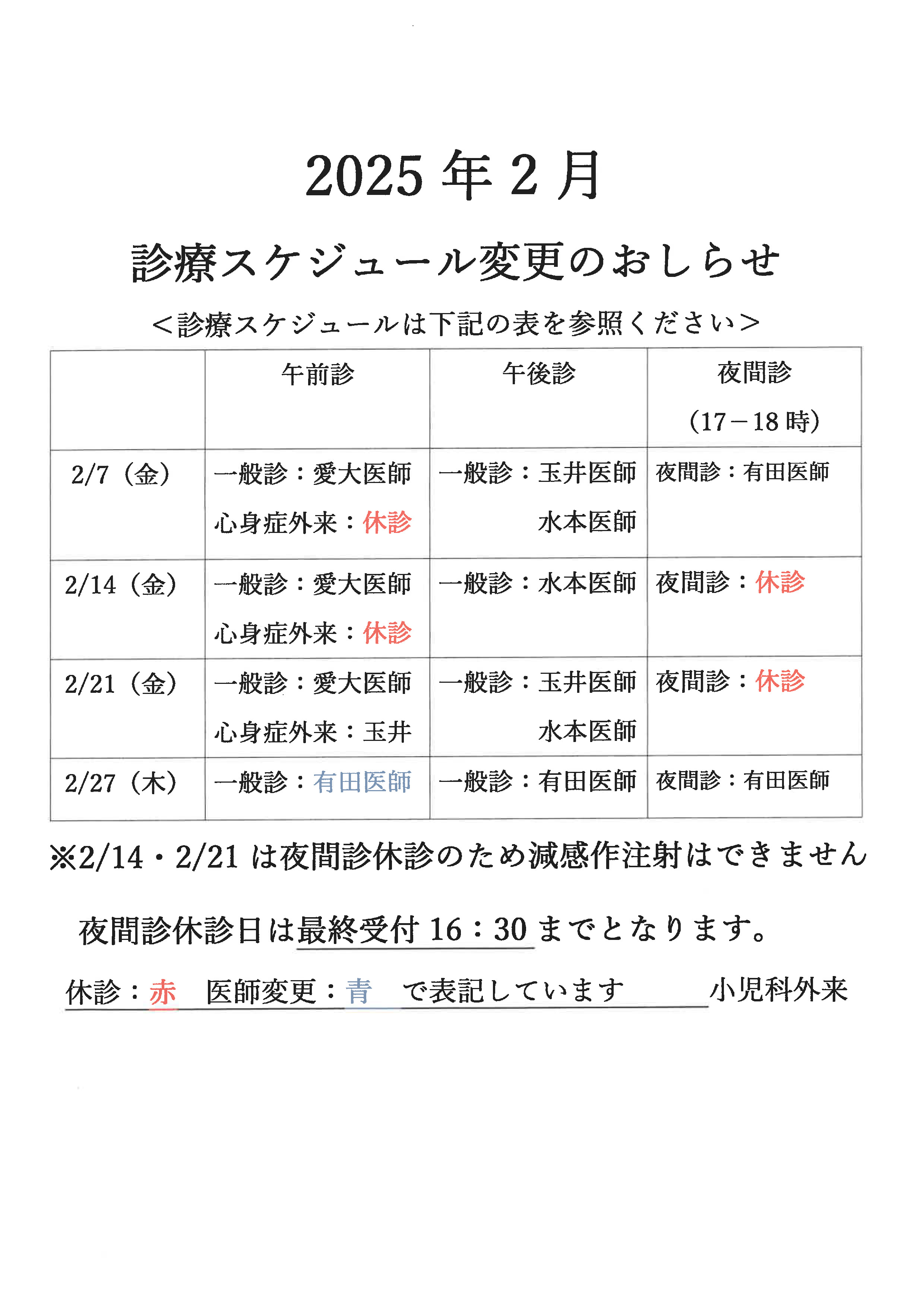 ・ 2/ 7(金) | 梶原医師 | 午前診休診 | |