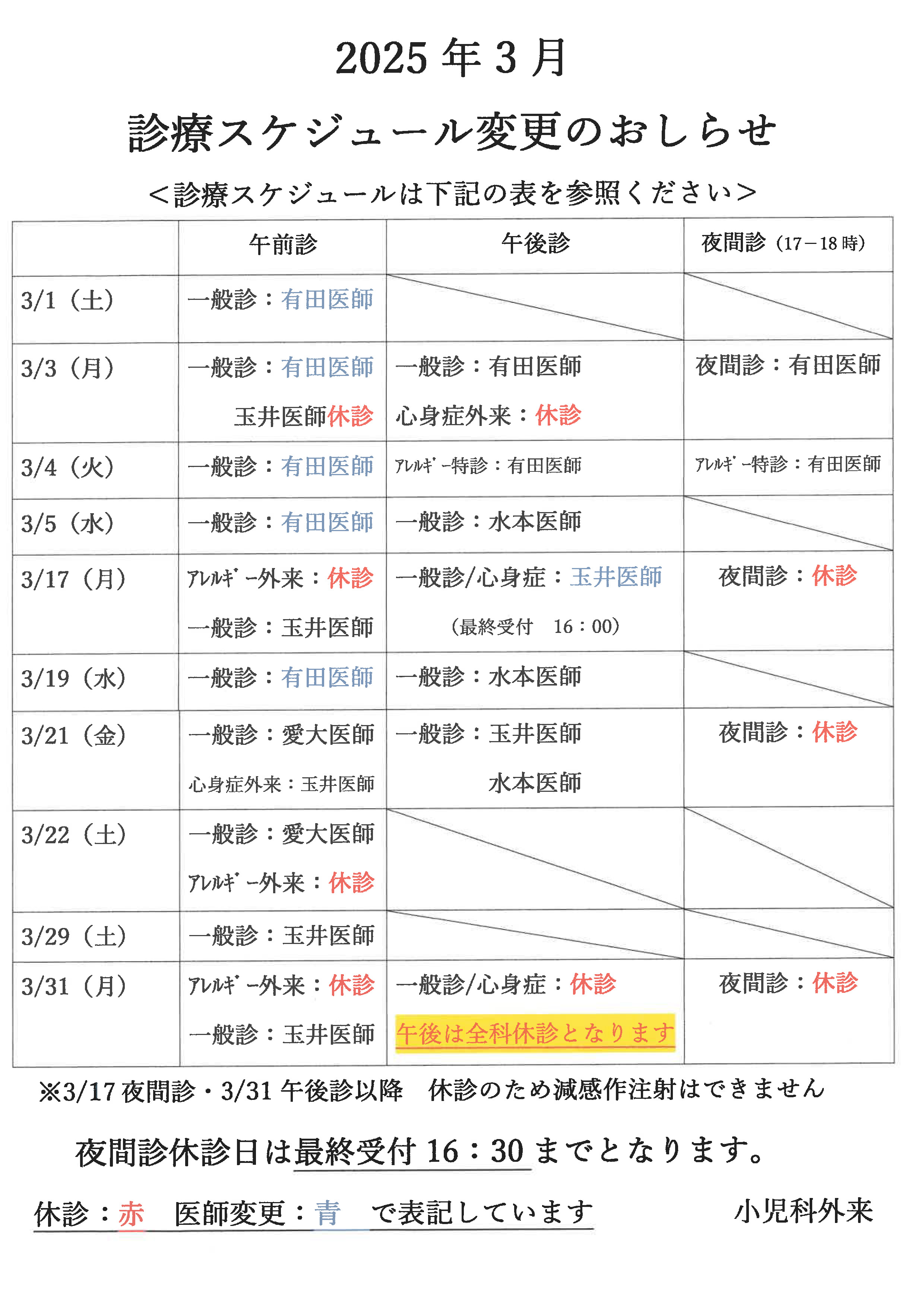 ・ 3/31(月) | 尾﨑医師 | 午後診休診 | |