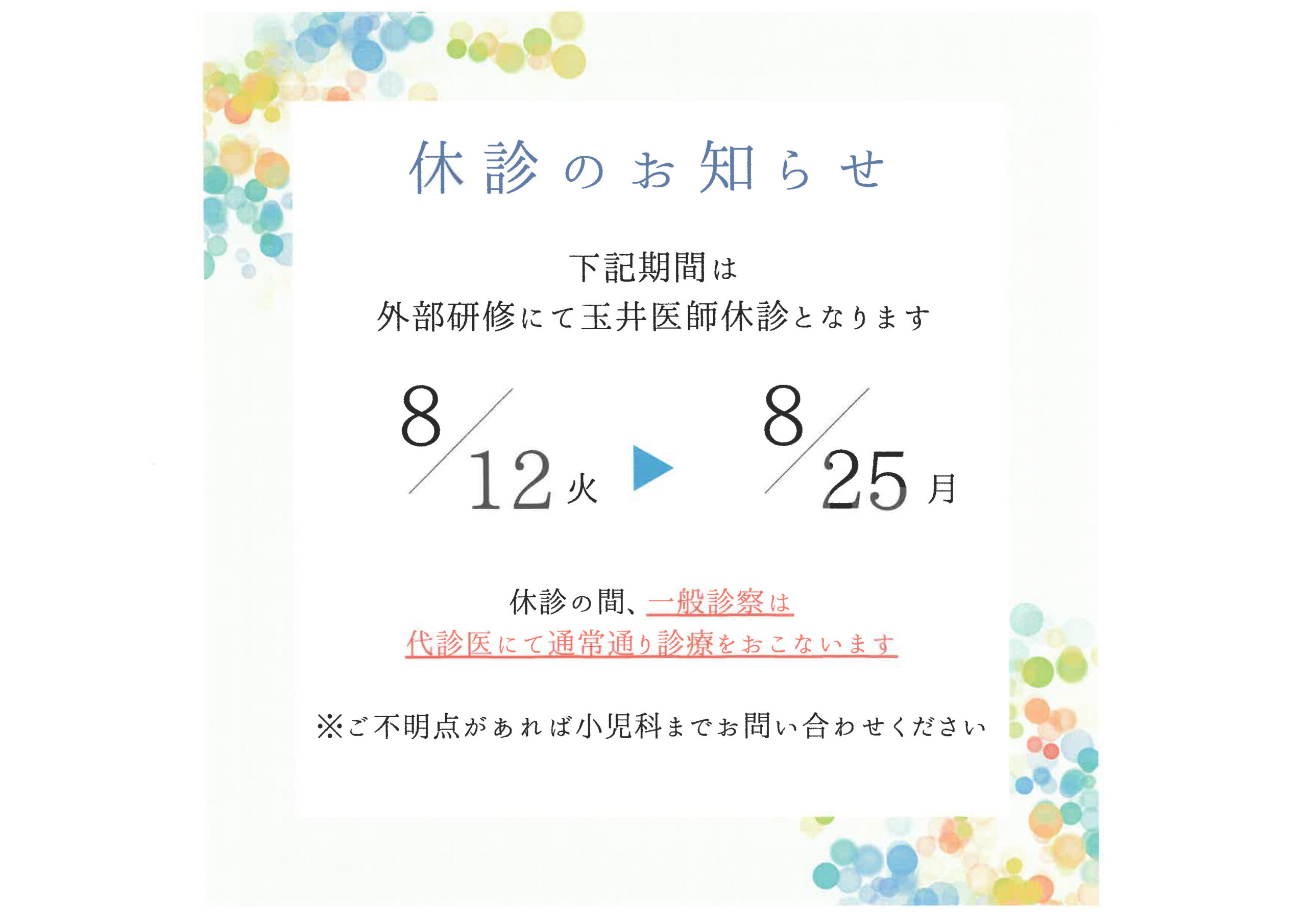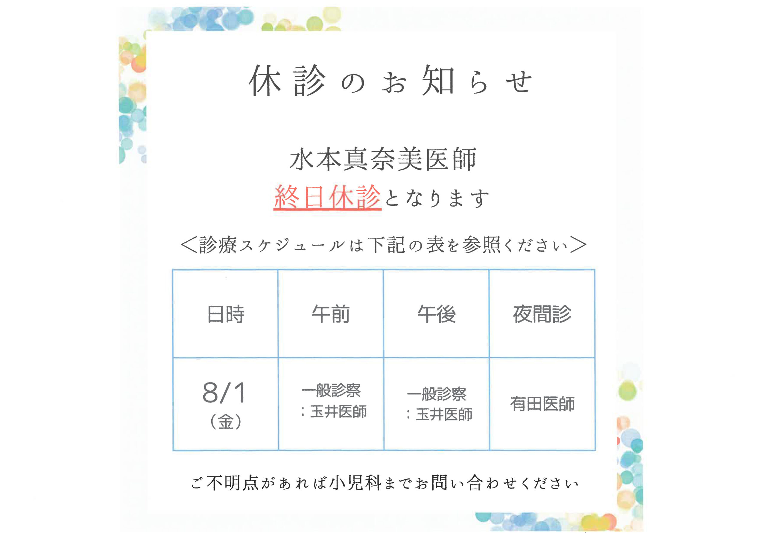 ・ 8/22(金) | 茂木医師 | 午前診休診(代診8/20) |